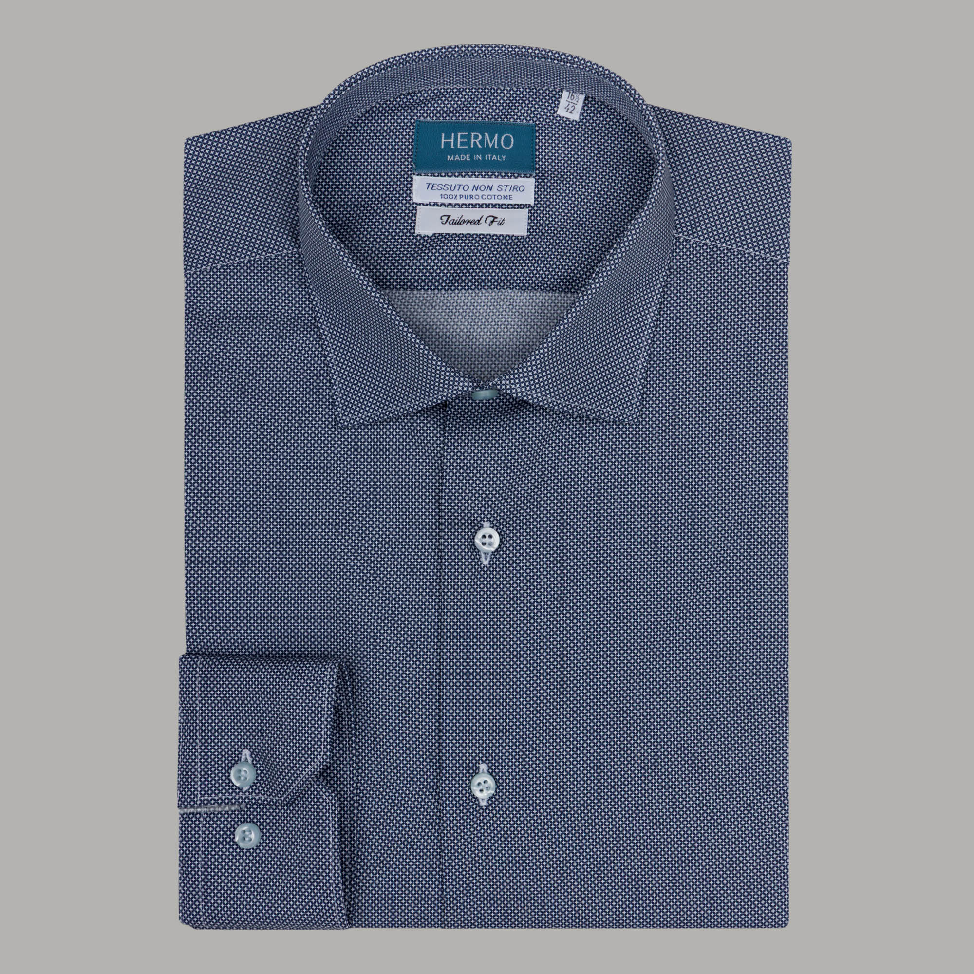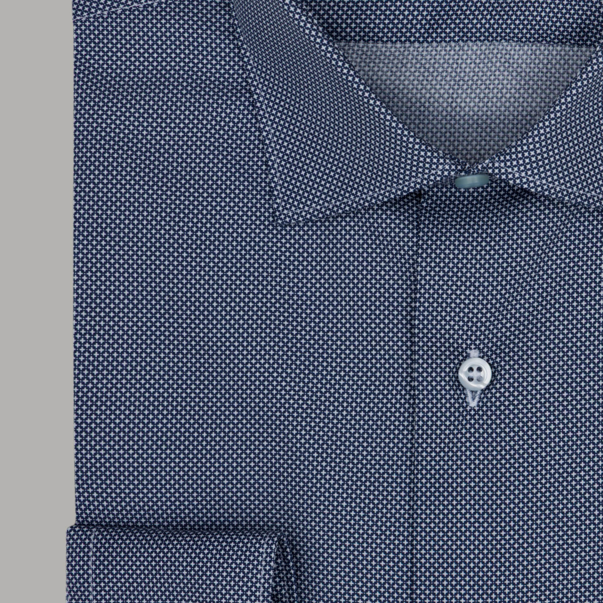 Il tessuto si presenta con una “microfantasia” a piccolo rombo grigio perla su fondo blu.