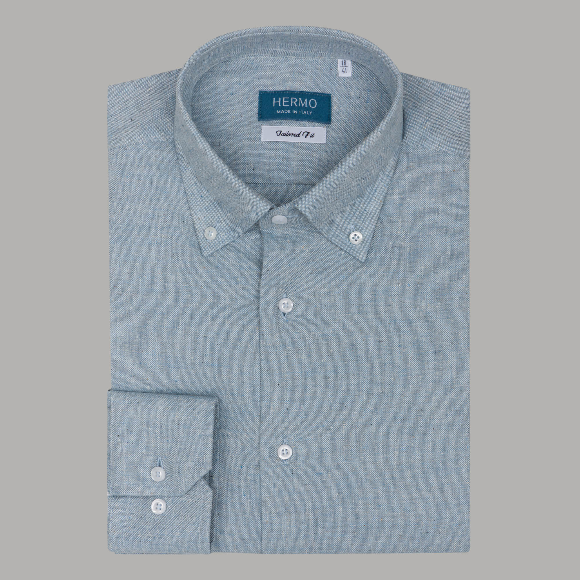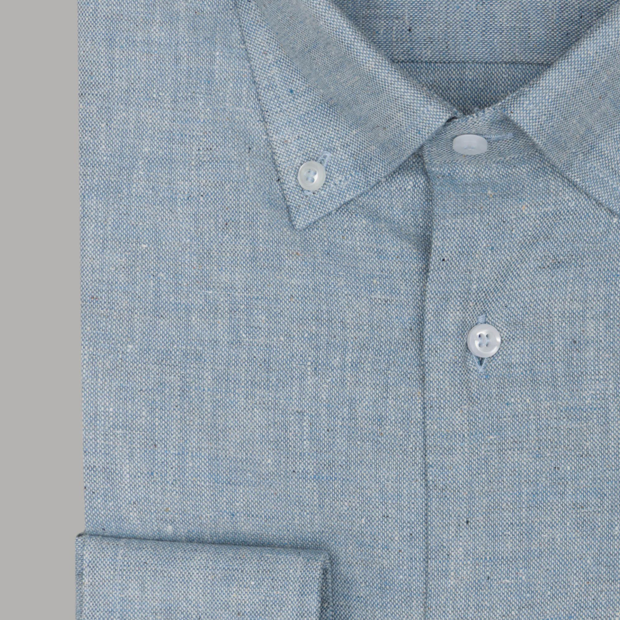 Tessuto canapa 100%, collo bottoncino, peso adatto per tutte le stagioni.